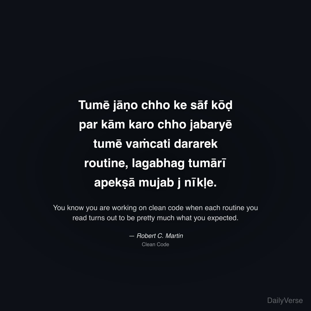 "Tumē jāṇo chho ke sāf kōḍ par kām karo chho jabaryē tumē vaṁcati dararek routine, lagabhag tumārī apekṣā mujab j nīkḷe." — Robert C. Martin