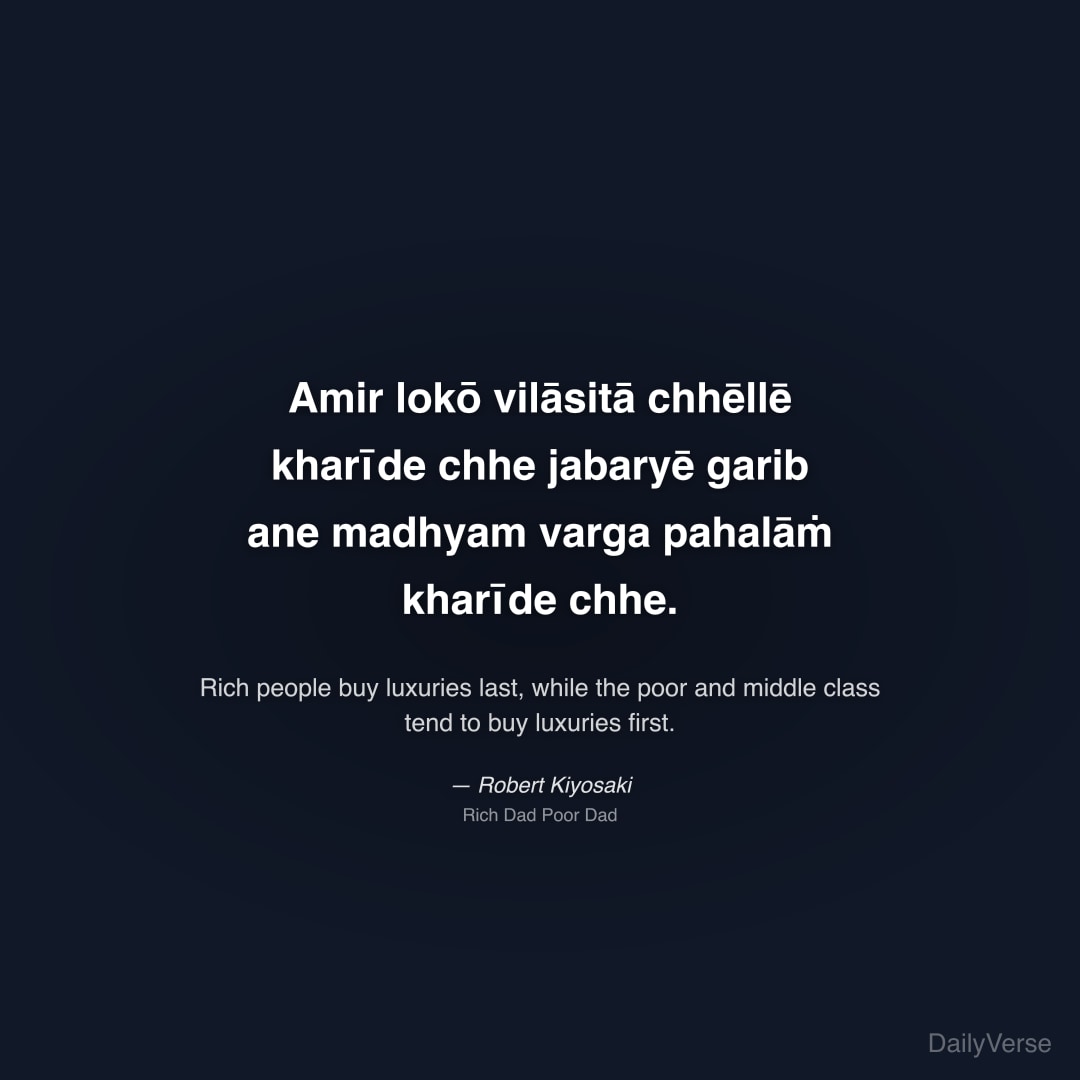 "Amir lokō vilāsitā chhēllē kharīde chhe jabaryē garib ane madhyam varga pahalāṁ kharīde chhe." — Robert Kiyosaki
