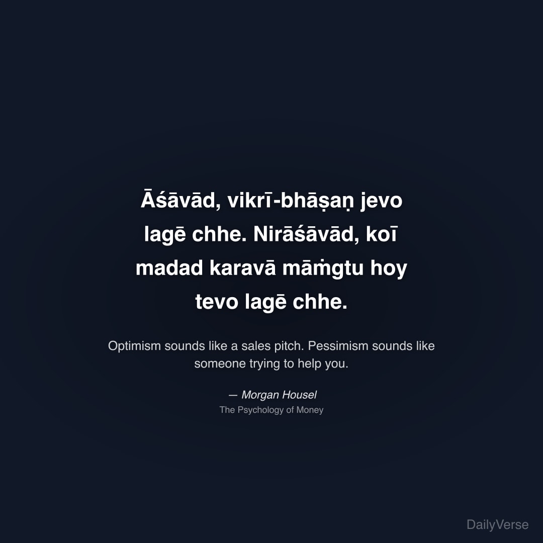 "Āśāvād, vikrī-bhāṣaṇ jevo lagē chhe. Nirāśāvād, koī madad karavā māṁgtu hoy tevo lagē chhe." — Morgan Housel