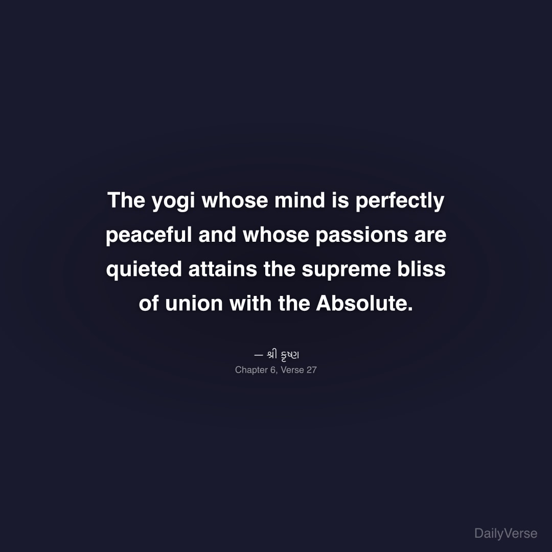 "The yogi whose mind is perfectly peaceful and whose passions are quieted attains the supreme bliss of union with the Absolute." — શ્રી કૃષ્ણ