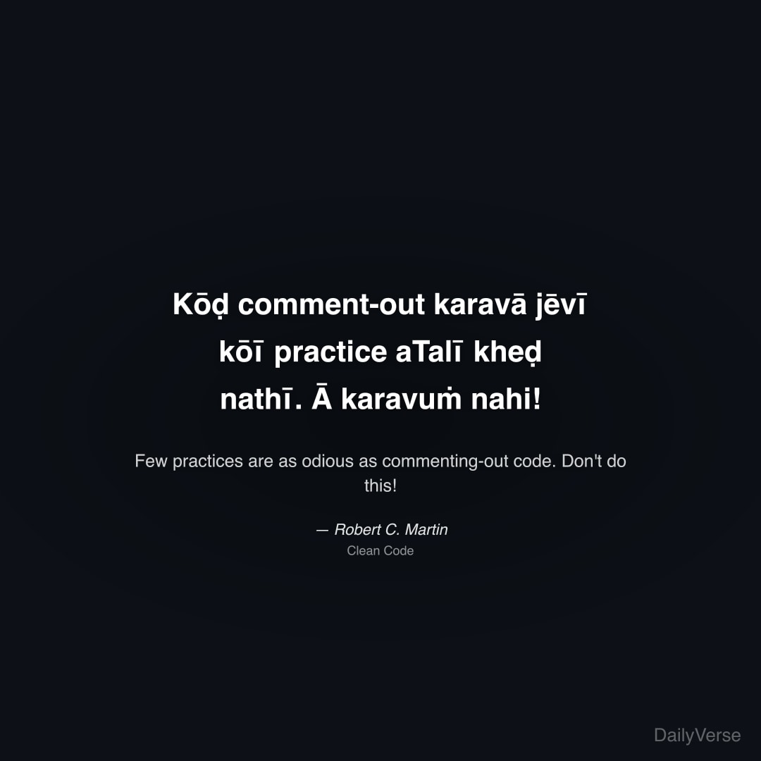 "Kōḍ comment-out karavā jēvī kōī practice aTalī kheḍ nathī. Ā karavuṁ nahi!" — Robert C. Martin