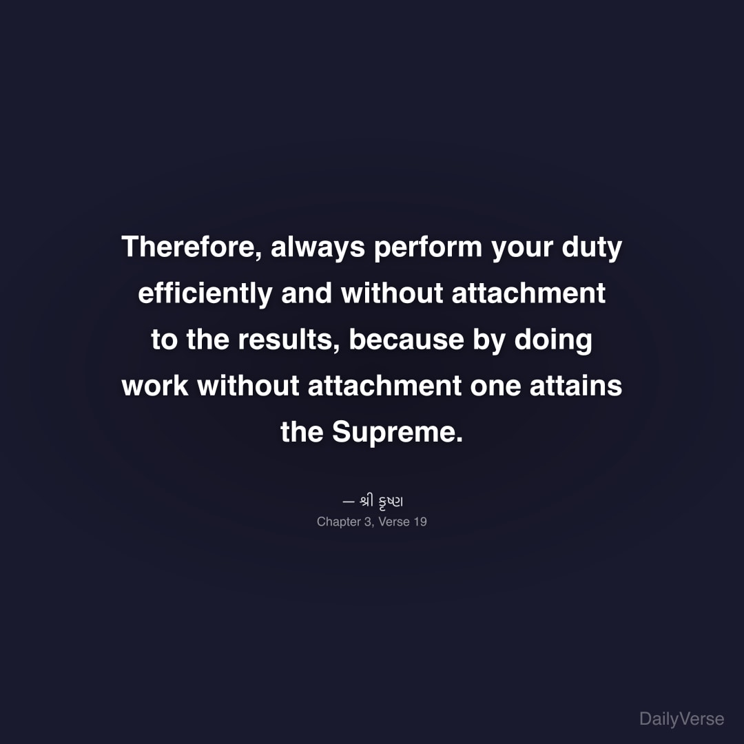 "Therefore, always perform your duty efficiently and without attachment to the results, because by doing work without attachment one attains the Supreme." — શ્રી કૃષ્ણ