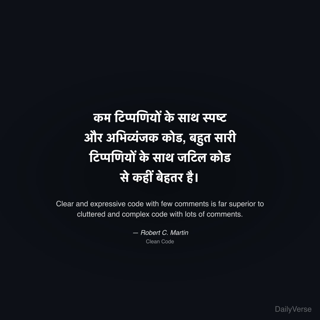 "कम टिप्पणियों के साथ स्पष्ट और अभिव्यंजक कोड, बहुत सारी टिप्पणियों के साथ जटिल कोड से कहीं बेहतर है।" — Robert C. Martin
