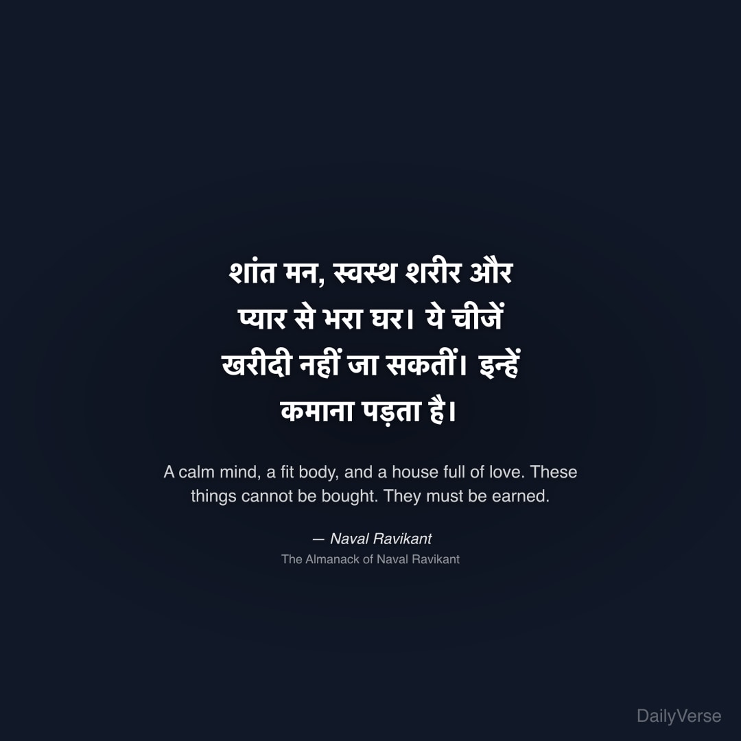 "शांत मन, स्वस्थ शरीर और प्यार से भरा घर। ये चीजें खरीदी नहीं जा सकतीं। इन्हें कमाना पड़ता है।" — Naval Ravikant