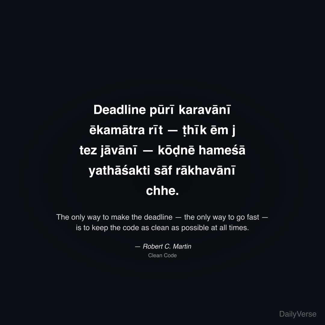 "Deadline pūrī karavānī ēkamātra rīt — ṭhīk ēm j tez jāvānī — kōḍnē hameśā yathāśakti sāf rākhavānī chhe." — Robert C. Martin