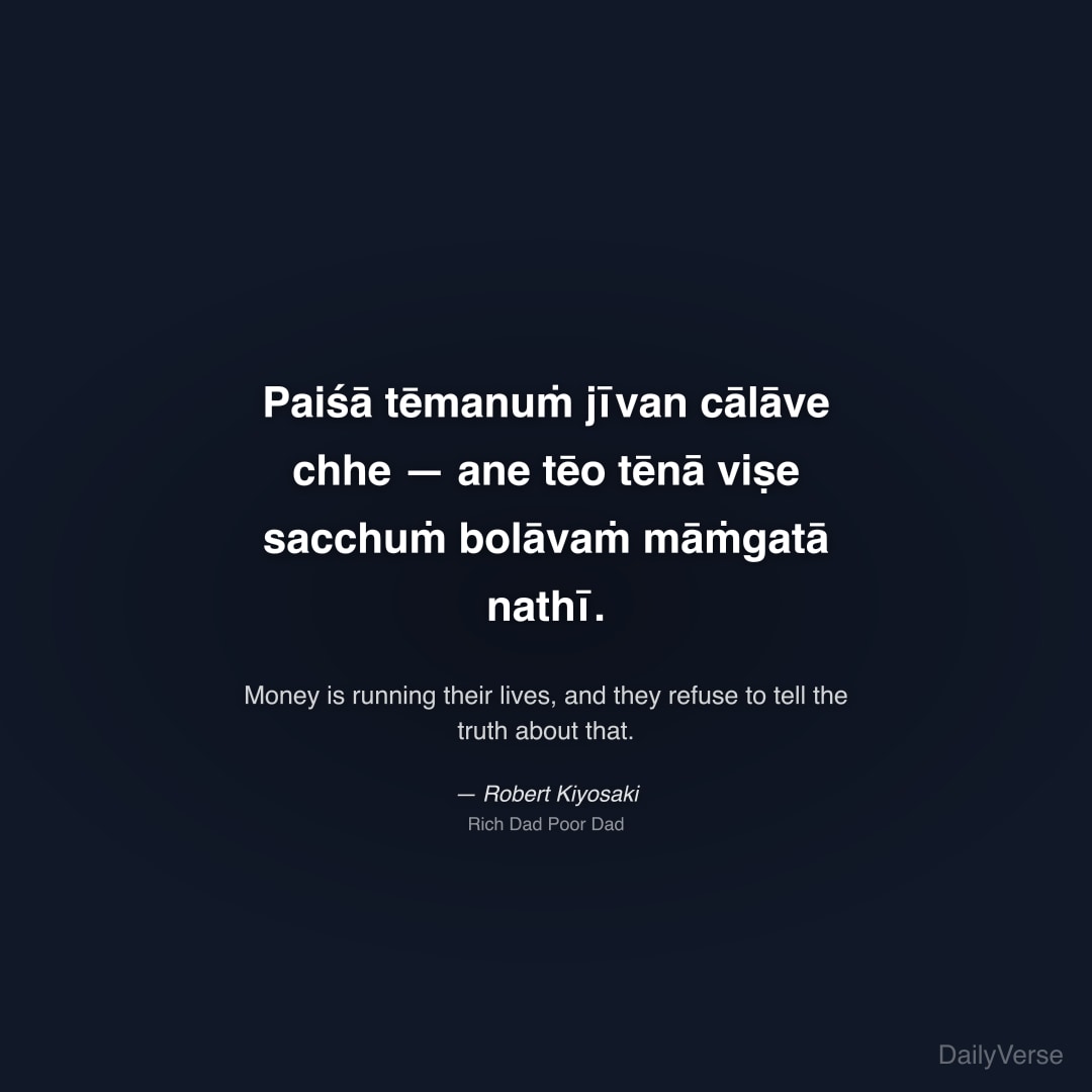 "Paiśā tēmanuṁ jīvan cālāve chhe — ane tēo tēnā viṣe sacchuṁ bolāvaṁ māṁgatā nathī." — Robert Kiyosaki
