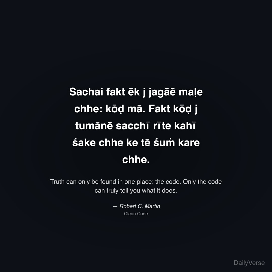 "Sachai fakt ēk j jagāē maḷe chhe: kōḍ mā. Fakt kōḍ j tumānē sacchī rīte kahī śake chhe ke tē śuṁ kare chhe." — Robert C. Martin