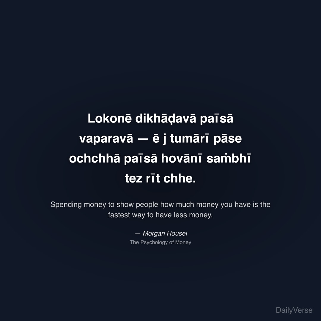 "Lokonē dikhāḍavā paīsā vaparavā — ē j tumārī pāse ochchhā paīsā hovānī saṁbhī tez rīt chhe." — Morgan Housel