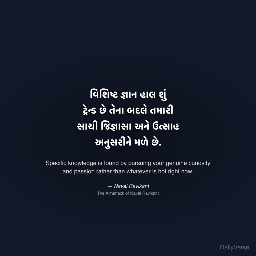 "વિશિષ્ટ જ્ઞાન હાલ શું ટ્રેન્ડ છે તેના બદલે તમારી સાચી જિજ્ઞાસા અને ઉત્સાહ અનુસરીને મળે છે." — Naval Ravikant