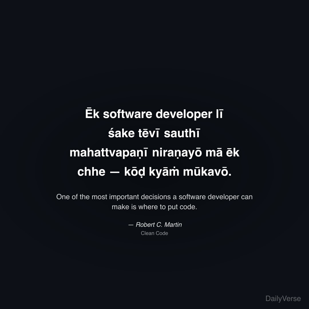 "Ēk software developer lī śake tēvī sauthī mahattvapaṇī niraṇayō mā ēk chhe — kōḍ kyāṁ mūkavō." — Robert C. Martin