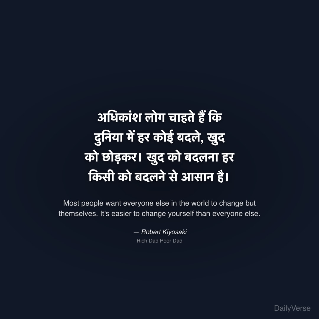 "अधिकांश लोग चाहते हैं कि दुनिया में हर कोई बदले, खुद को छोड़कर। खुद को बदलना हर किसी को बदलने से आसान है।" — Robert Kiyosaki