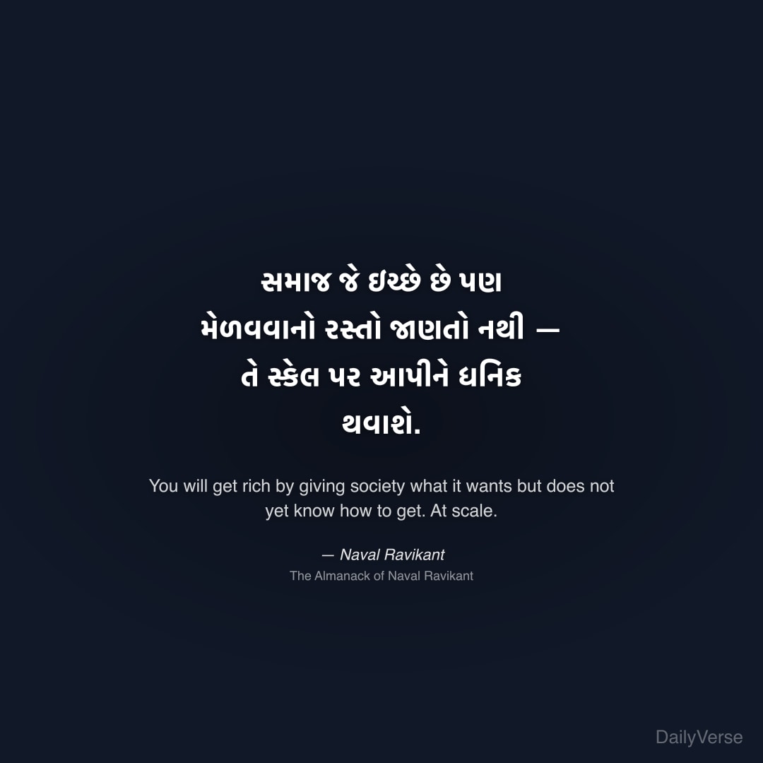 "સમાજ જે ઇચ્છે છે પણ મેળવવાનો રસ્તો જાણતો નથી — તે સ્કેલ પર આપીને ધનિક થવાશે." — Naval Ravikant