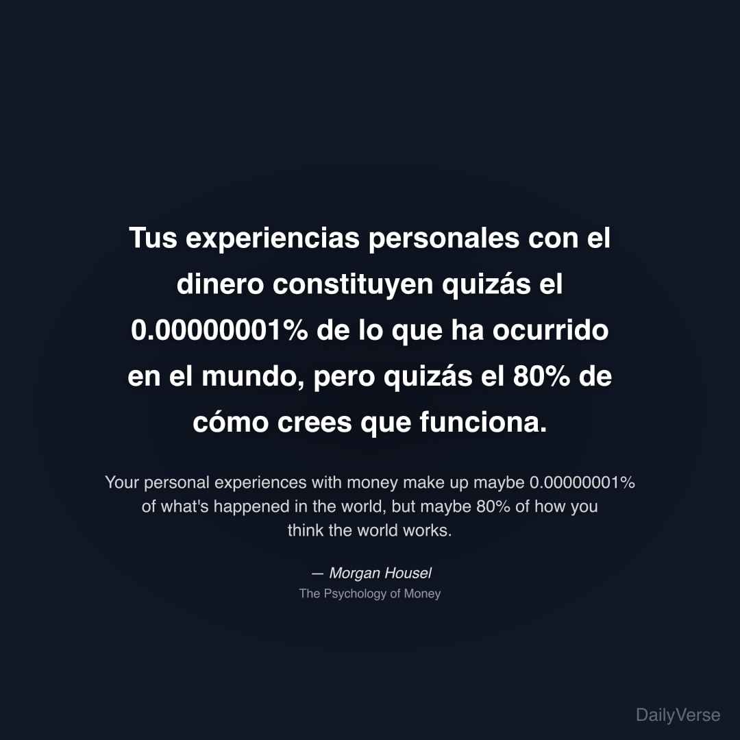 "Tus experiencias personales con el dinero constituyen quizás el 0.00000001% de lo que ha ocurrido en el mundo, pero quizás el 80% de cómo crees que funciona." — Morgan Housel