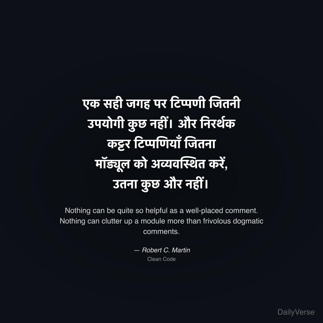 "एक सही जगह पर टिप्पणी जितनी उपयोगी कुछ नहीं। और निरर्थक कट्टर टिप्पणियाँ जितना मॉड्यूल को अव्यवस्थित करें, उतना कुछ और नहीं।" — Robert C. Martin