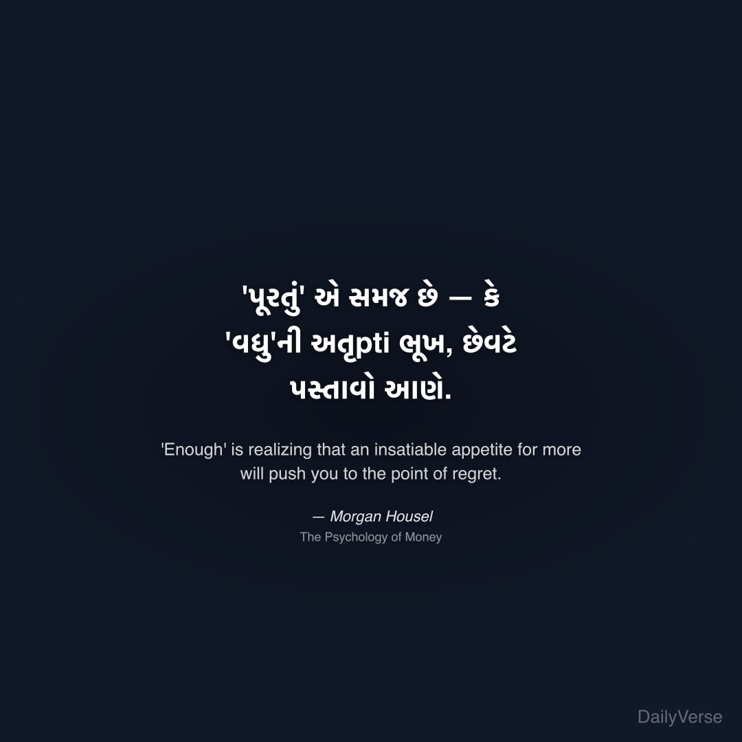"'પૂરતું' એ સમજ છે — કે 'વધુ'ની અતૃpti ભૂખ, છેવટે પસ્તાવો આણે." — Morgan Housel