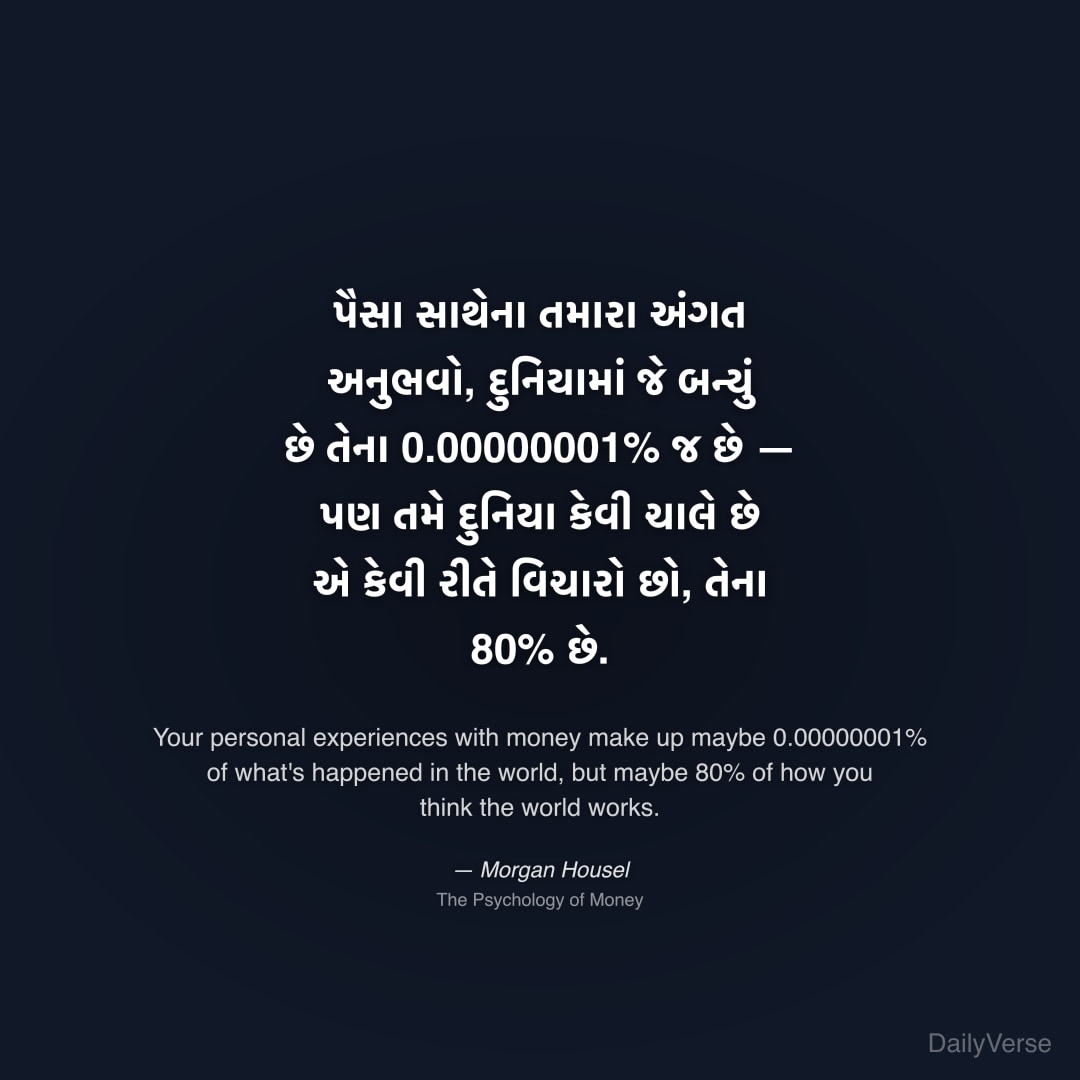 "પૈસા સાથેના તમારા અંગત અનુભવો, દુનિયામાં જે બન્યું છે તેના 0.00000001% જ છે — પણ તમે દુનિયા કેવી ચાલે છે એ કેવી રીતે વિચારો છો, તેના 80% છે." — Morgan Housel