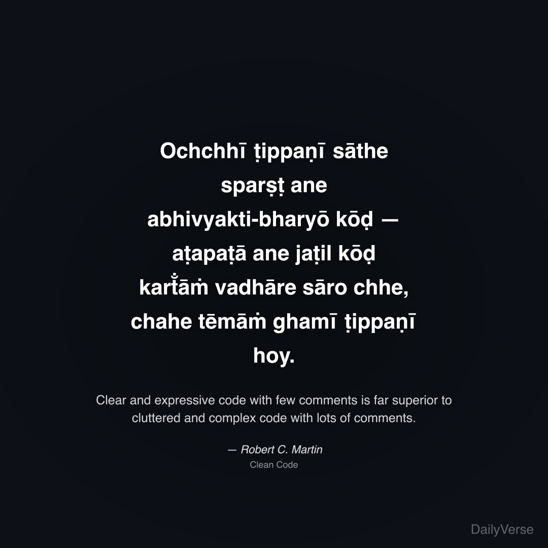 "Ochchhī ṭippaṇī sāthe sparṣṭ ane abhivyakti-bharyō kōḍ — aṭapaṭā ane jaṭil kōḍ kart̐āṁ vadhāre sāro chhe, chahe tēmāṁ ghamī ṭippaṇī hoy." — Robert C. Martin