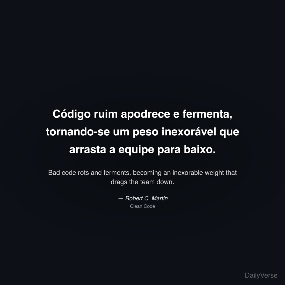 "Código ruim apodrece e fermenta, tornando-se um peso inexorável que arrasta a equipe para baixo." — Robert C. Martin