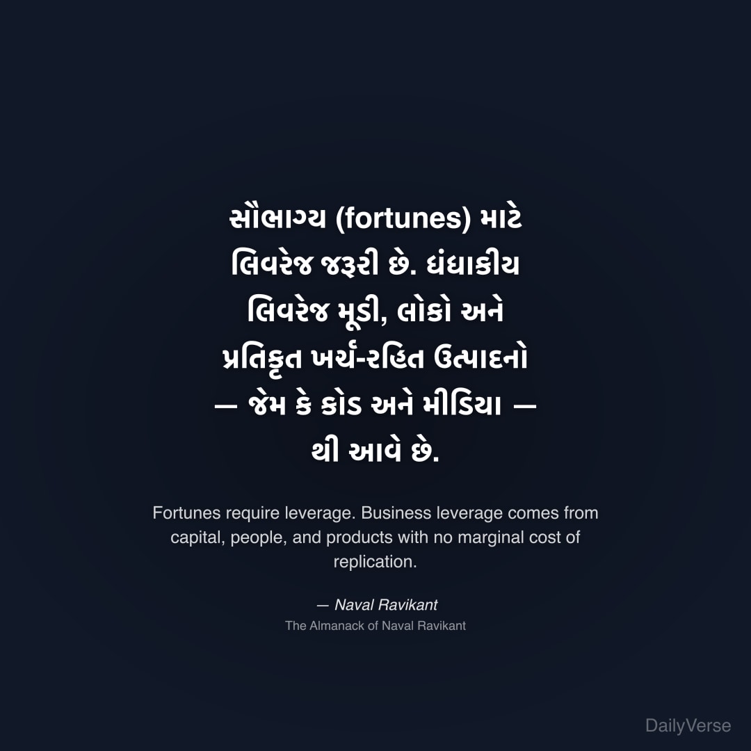 "સૌભાગ્ય (fortunes) માટે લિવરેજ જરૂરી છે. ધંધાકીય લિવરેજ મૂડી, લોકો અને પ્રતિકૃત ખર્ચ-રહિત ઉત્પાદનો — જેમ કે કોડ અને મીડિયા — થી આવે છે." — Naval Ravikant