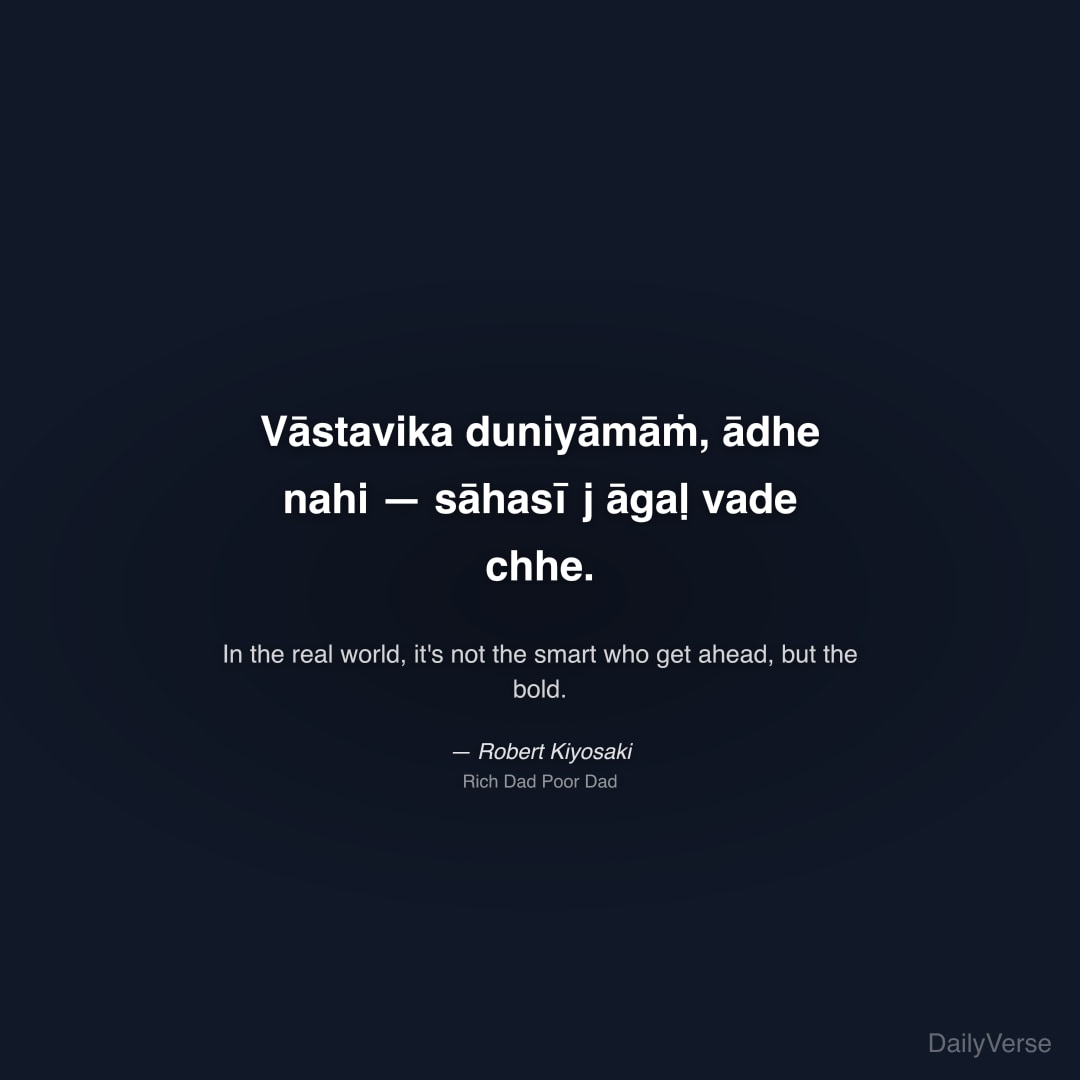 "Vāstavika duniyāmāṁ, ādhe nahi — sāhasī j āgaḷ vade chhe." — Robert Kiyosaki