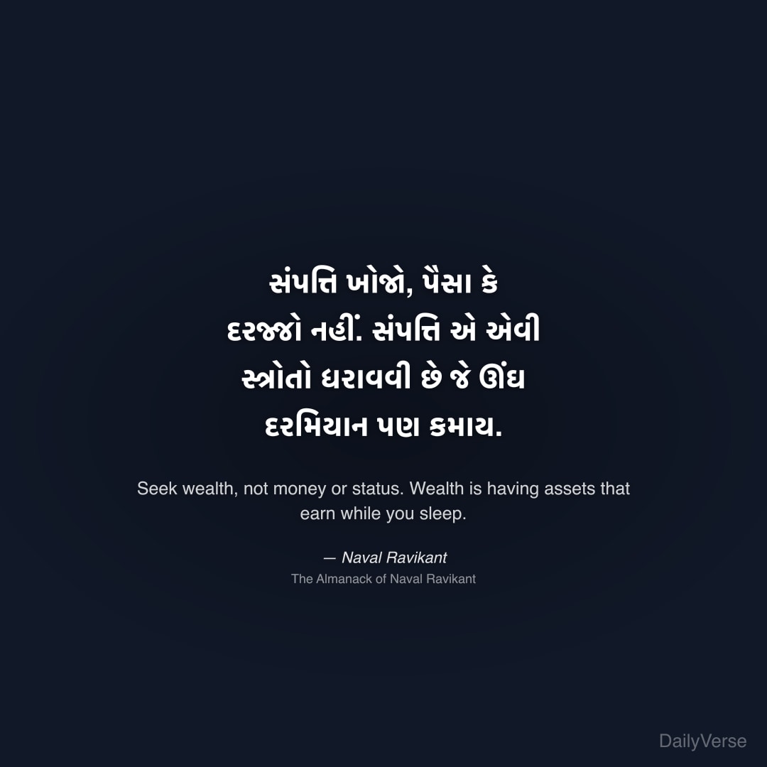 "સંપત્તિ ખોજો, પૈસા કે દરજ્જો નહીં. સંપત્તિ એ એવી સ્ત્રોતો ધરાવવી છે જે ઊંઘ દરમિયાન પણ કમાય." — Naval Ravikant