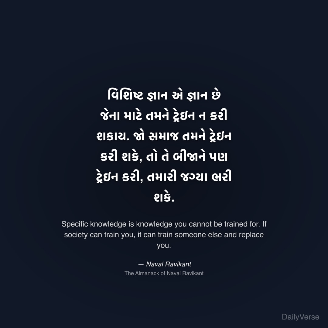 "વિશિષ્ટ જ્ઞાન એ જ્ઞાન છે જેના માટે તમને ટ્રેઇન ન કરી શકાય. જો સમાજ તમને ટ્રેઇન કરી શકે, તો તે બીજાને પણ ટ્રેઇન કરી, તમારી જગ્યા ભરી શકે." — Naval Ravikant